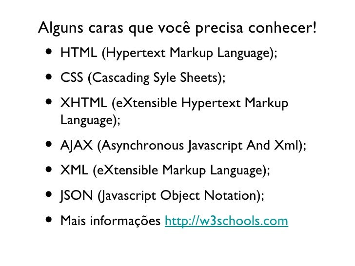 2. 2. Alguns caras que você precisa conhecer! <ul><li>HTML (Hypertext Markup Language); </li></ul><ul><li>CSS (Cascading Syle Sheets); </li></ul><ul><li>XHTML (eXtensible Hypertext Markup Language); </li></ul><ul><li>AJAX (Asynchronous Javascript And Xml); </li></ul><ul><li>XML (eXtensible Markup Language); </li></ul><ul><li>JSON (Javascript Object Notation); </li></ul><ul><li>Mais informações http://w3schools.com </li></ul>