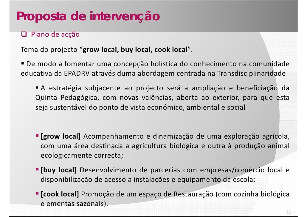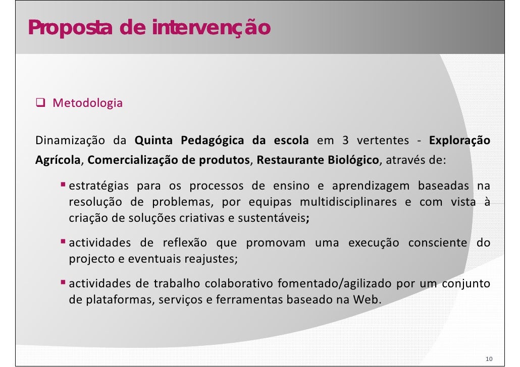 10. 10. Proposta de intervenção Metodologia Dinamização da Quinta Pedagógica da escola em 3 vertentes ‐ Exploração Agrícola, Comercialização de produtos, Restaurante Biológico, através de: estratégias para os processos de ensino e aprendizagem baseadas na resolução de problemas por equipas multidisciplinares e com vista à problemas, criação de soluções criativas e sustentáveis; actividades de reflexão que promovam uma execução consciente do projecto e eventuais reajustes; actividades de trabalho colaborativo fomentado/agilizado por um conjunto de plataformas, serviços e ferramentas baseado na Web. 10