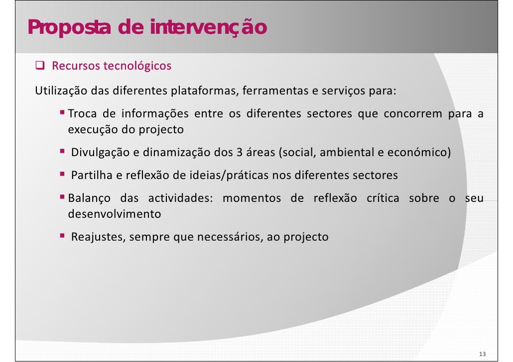 13. 13. Proposta de intervenção Recursos tecnológicos Utilização das diferentes plataformas, ferramentas e serviços para:  Troca de informações entre os diferentes sectores que concorrem para a execução do projecto Divulgação e dinamização dos 3 áreas (social, ambiental e económico) Partilha e reflexão de ideias/práticas nos diferentes sectores Balanço das actividades: momentos de reflexão crítica sobre o seu desenvolvimento Reajustes, sempre que necessários, ao projecto j , p q , p j 13
