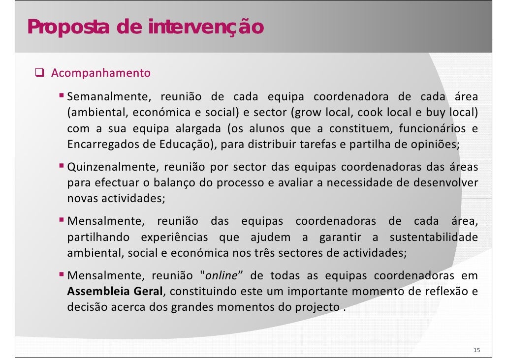 15. 15. Proposta de intervenção Acompanhamento p Semanalmente, reunião de cada equipa coordenadora de cada área (ambiental, económica e social) e sector (grow local, cook local e buy local) com a sua equipa alargada (os alunos que a constituem, funcionários e Encarregados de Educação), para distribuir tarefas e partilha de opiniões; Quinzenalmente, reunião por sector das equipas coordenadoras das áreas para efectuar o balanço do processo e avaliar a necessidade de desenvolver novas actividades; Mensalmente, reunião das equipas coordenadoras de cada área, partilhando experiências que ajudem a garantir a sustentabilidade ambiental, social e económica nos três sectores de actividades; Mensalmente, reunião "online” de todas as equipas coordenadoras em online Assembleia Geral, constituindo este um importante momento de reflexão e decisão acerca dos grandes momentos do projecto . 15