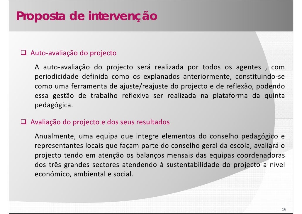 16. 16. Proposta de intervenção Auto‐ Auto‐avaliação do projecto A auto‐avaliação do projecto será realizada por todos os agentes , com periodicidade definida como os explanados anteriormente, constituindo‐se como uma ferramenta de ajuste/reajuste do projecto e de reflexão, podendo essa gestão de trabalho reflexiva ser realizada na plataforma da quinta pedagógica. Avaliação do projecto e dos seus resultados Anualmente, uma equipa que integre elementos do conselho pedagógico e representantes locais que façam parte do conselho geral da escola, avaliará o projecto tendo em atenção os balanços mensais das equipas coordenadoras dos três grandes sectores atendendo à sustentabilidade do projecto a nível económico, ambiental e social. 16