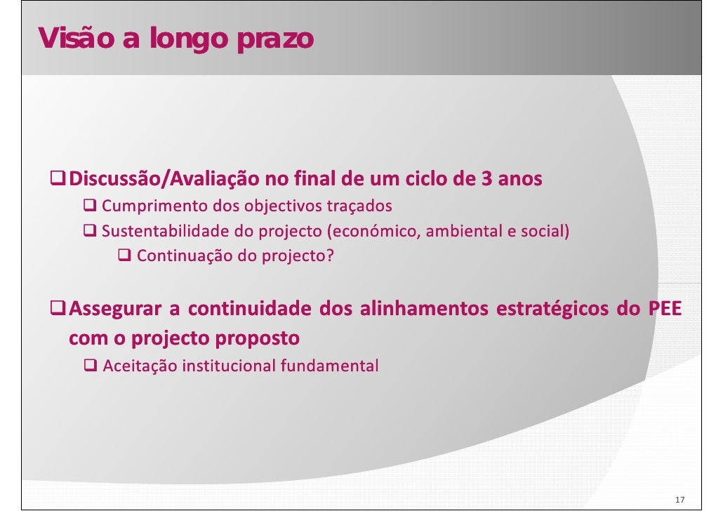 17. 17. Visão a longo prazo Discussão/Avaliação no f l d um ciclo d 3 anos ã / l ã final de l de Cumprimento dos objectivos traçados Sustentabilidade do S t t bilid d d projecto ( j t (económico, ambiental e social) ó i bi t l i l) Continuação do projecto? Assegurar a continuidade dos alinhamentos estratégicos do PEE com o projecto proposto Aceitação institucional fundamental 17