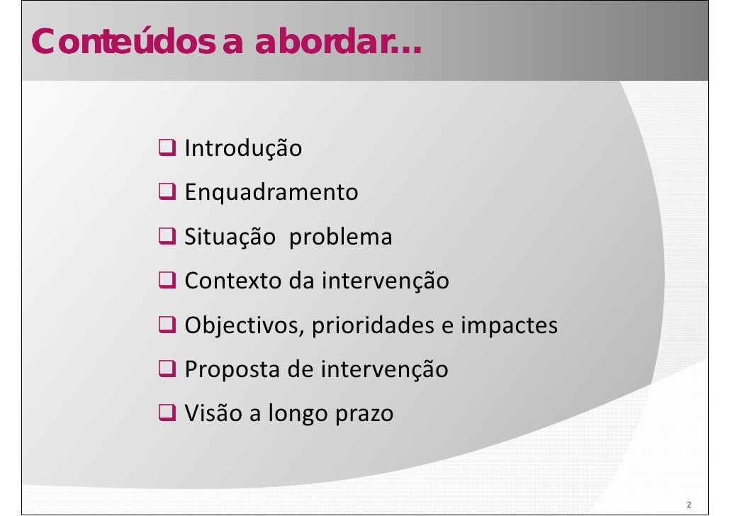 2. 2. Conteúdos a abordar… Introdução Enquadramento Situação  problema Si ã bl Contexto da intervenção Contexto da intervenção Objectivos, prioridades e impactes Proposta de intervenção Visão a longo prazo 2