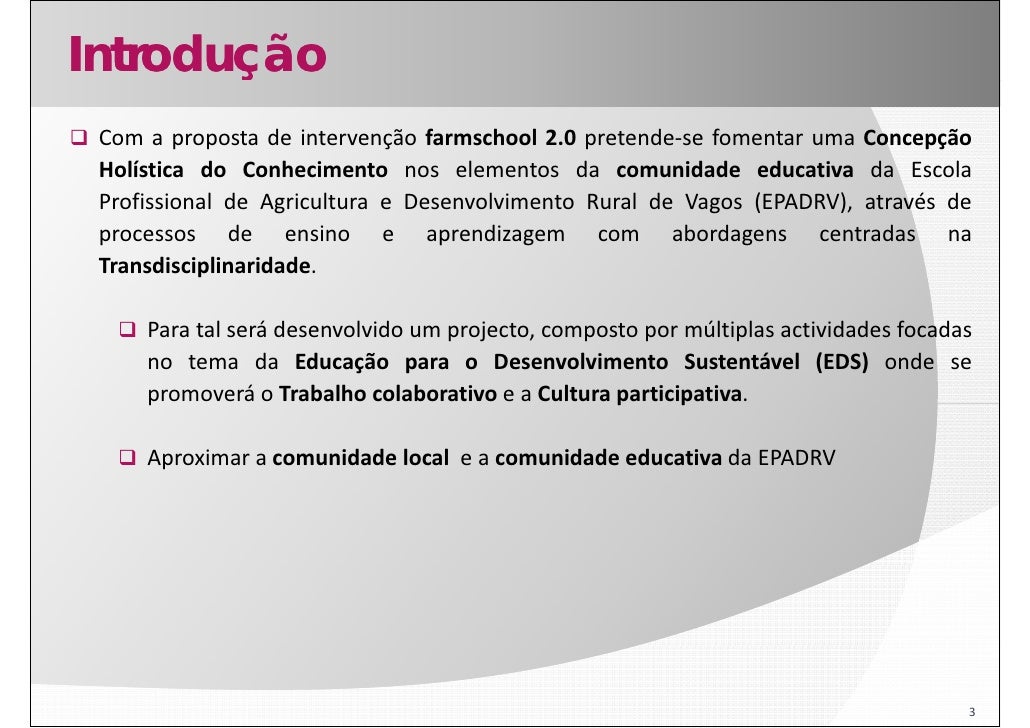 3. 3. Introdução Com a proposta de intervenção farmschool 2.0 pretende‐se fomentar uma Concepção Holística d Conhecimento nos elementos d comunidade educativa d Escola lí i do h i l da id d d i da l Profissional de Agricultura e Desenvolvimento Rural de Vagos (EPADRV), através de p processos de ensino e aprendizagem com abordagens centradas na p g g Transdisciplinaridade. Para l á desenvolvido um projecto, composto por múltiplas actividades f d P tal será d l id j úl i l i id d focadas no tema da Educação para o Desenvolvimento Sustentável (EDS) onde se p promoverá o Trabalho colaborativo e a Cultura participativa. p p Aproximar a comunidade local e a comunidade educativa da EPADRV 3
