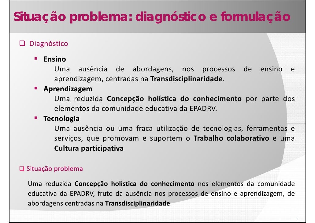 5. 5. Situação problema: diagnóstico e formulação Diagnóstico Ensino Uma ausência de abordagens, nos processos de ensino e aprendizagem, centradas na Transdisciplinaridade. Aprendizagem Uma reduzida Concepção holística do conhecimento por parte dos elementos da comunidade educativa da EPADRV. Tecnologia Uma ausência ou uma fraca utilização de tecnologias, ferramentas e serviços, que promovam e suportem o Trabalho colaborativo e uma Cultura participativa Situação problema Uma reduzida Concepção holística do conhecimento nos elementos da comunidade educativa da EPADRV, fruto da ausência nos processos de ensino e aprendizagem, de abordagens centradas na Transdisciplinaridade. 5