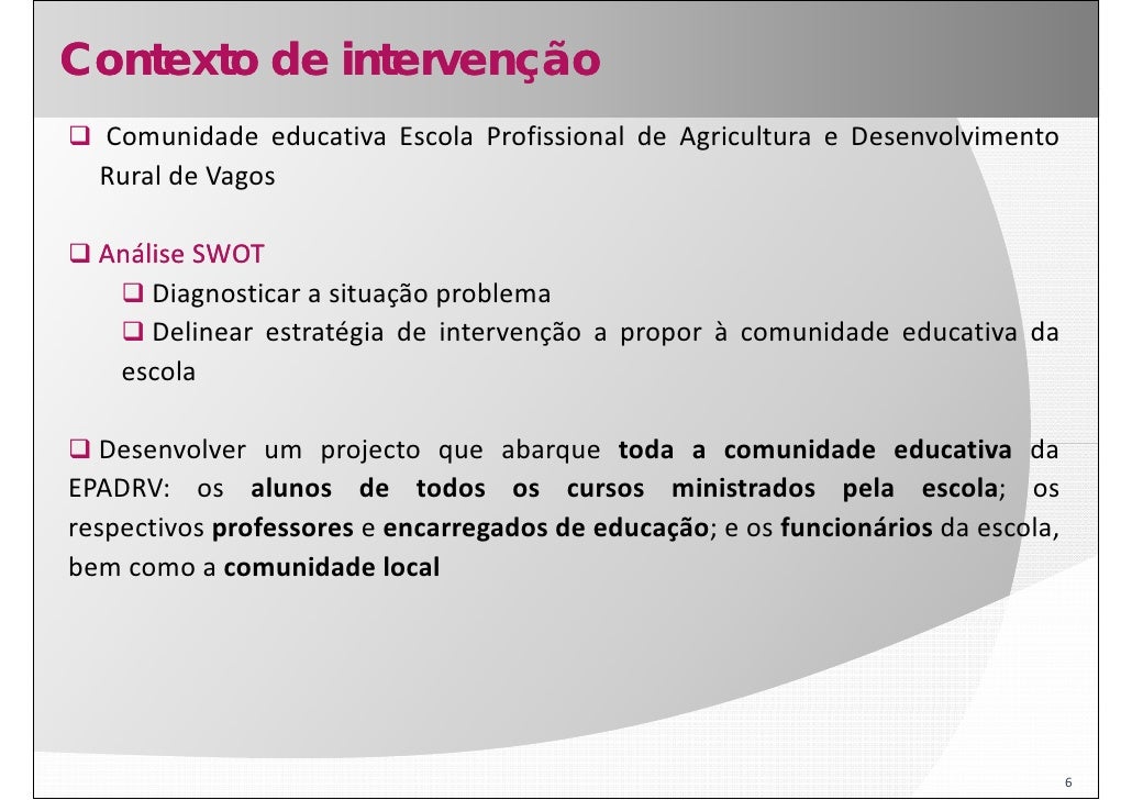 6. 6. Contexto de intervenção Comunidade educativa Escola Profissional de Agricultura e Desenvolvimento Rural de Vagos Análise SWOT Diagnosticar a situação problema Delinear estratégia de intervenção a propor à comunidade educativa da escola Desenvolver um projecto que abarque t d a comunidade educativa d D l j t b toda id d d ti da EPADRV: os alunos de todos os cursos ministrados pela escola; os respectivos professores e encarregados de educação; e os funcionários da escola escola, bem como a comunidade local 6