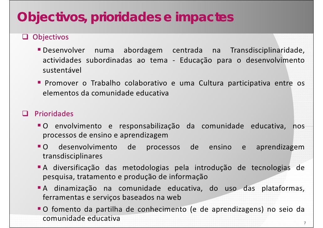 7. 7. Objectivos, prioridades e impactes Objectivos Desenvolver numa abordagem centrada na Transdisciplinaridade Transdisciplinaridade, actividades subordinadas ao tema ‐ Educação para o desenvolvimento sustentável Promover o Trabalho colaborativo e uma Cultura participativa entre os elementos da comunidade educativa Prioridades O envolvimento e responsabilização da comunidade educativa nos educativa, processos de ensino e aprendizagem O desenvolvimento de processos de ensino e aprendizagem transdisciplinares A diversificação das metodologias pela introdução de tecnologias de pesquisa, pesquisa tratamento e produção de informação A dinamização na comunidade educativa, do uso das plataformas, ferramentas e serviços baseados na web O fomento da partilha de conhecimento (e de aprendizagens) no seio da comunidade educativa 7