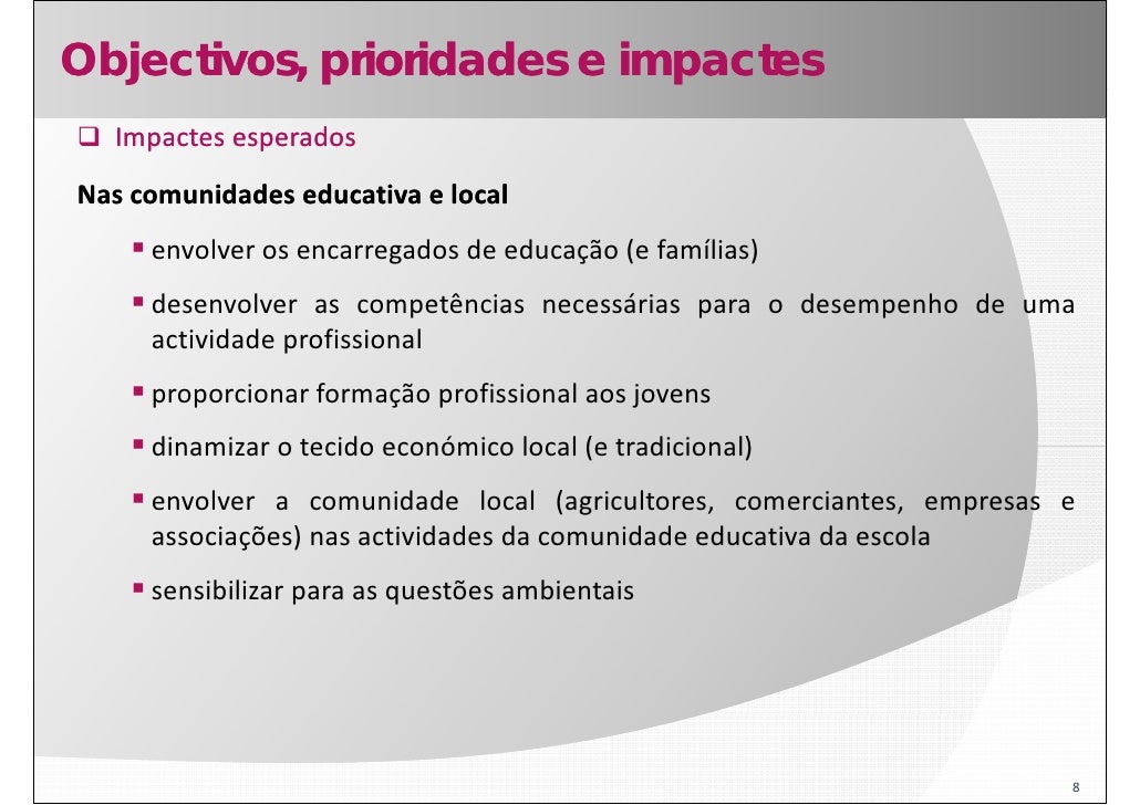 8. 8. Objectivos, prioridades e impactes Impactes esperados Nas comunidades educativa e local envolver os encarregados de educação (e famílias) desenvolver as competências necessárias para o desempenho de uma actividade profissional proporcionar formação profissional aos jovens dinamizar o tecido económico local (e tradicional) envolver a comunidade local (agricultores, comerciantes, empresas e associações) nas actividades da comunidade educativa da escola sensibilizar para as questões ambientais 8