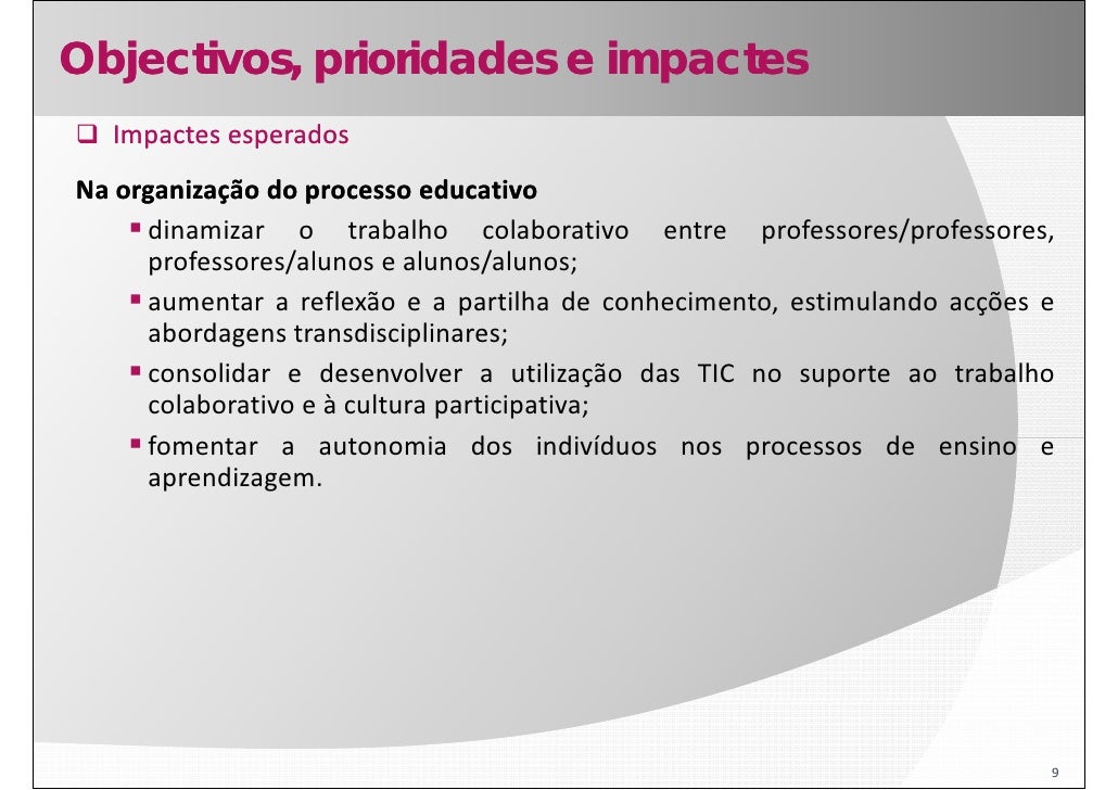 9. 9. Objectivos, prioridades e impactes Impactes esperados Na organização do processo educativo dinamizar o trabalho colaborativo entre professores/professores, professores/alunos e alunos/alunos; aumentar a reflexão e a partilha de conhecimento, estimulando acções e abordagens transdisciplinares; consolidar e desenvolver a utilização das TIC no suporte ao trabalho colaborativo e à cultura participativa; fomentar a autonomia d f t t i dos i di íd indivíduos nos processos d ensino e de i aprendizagem. 9