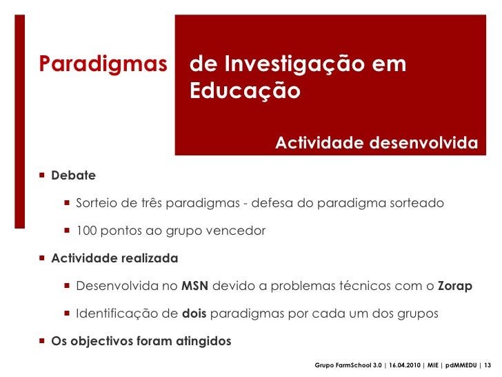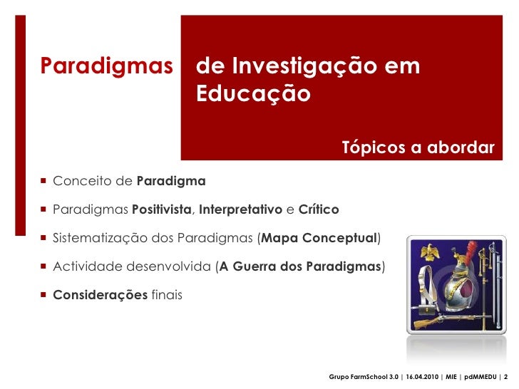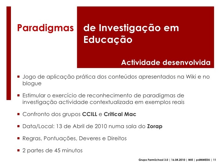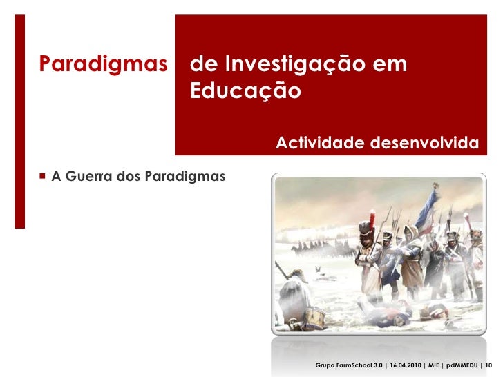 34. 34. Paradigmasde Investigação em Educação<br />Actividade desenvolvida<br /><ul><li>A Guerra dos Paradigmas</li></ul>Grupo FarmSchool 3.0 | 16.04.2010 | MIE | pdMMEDU | 10<br />