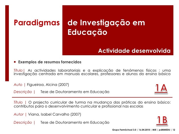 41. 41. Paradigmasde Investigação em Educação<br />Actividade desenvolvida<br /><ul><li>Exemplos de resumos fornecidos</li></ul>Título| As actividades laboratoriais e a explicação de fenómenos físicos : uma investigação centrada em manuais escolares, professores e alunos do ensino básico <br />Auto |Figueiroa, Alcina (2007) <br />Descrição | Tese de Doutoramento em Educação <br />1A<br />Título | O projecto curricular de turmanamudança das práticas do ensinobásico: contributosparaodesenvolvimento curricular eprofissionalnasescolas<br />Autor |Viana, Isabel Carvalho (2007)<br />Descrição | Tese de Doutoramento em Educação <br />1B<br />Grupo FarmSchool 3.0 | 16.04.2010 | MIE | pdMMEDU | 12<br />