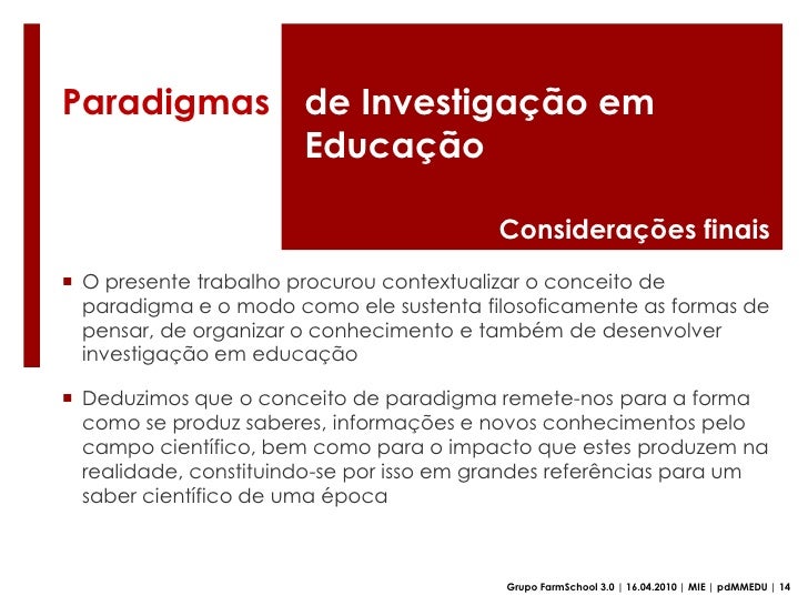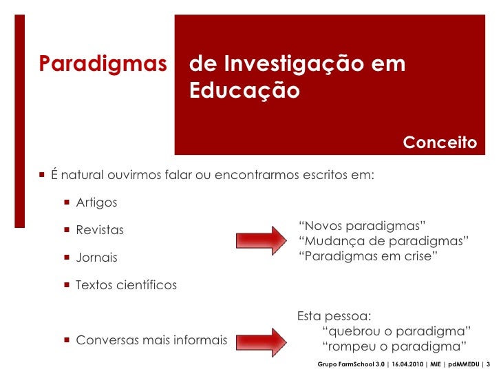 50. 50. Deduzimos que o conceito de paradigma remete-nos para a forma como se produz saberes, informações e novos conhecimentos pelo campo científico, bem como para o impacto que estes produzem na realidade, constituindo-se por isso em grandes referências para um saber científico de uma época</li></ul>Grupo FarmSchool 3.0 | 16.04.2010 | MIE | pdMMEDU | 14<br />