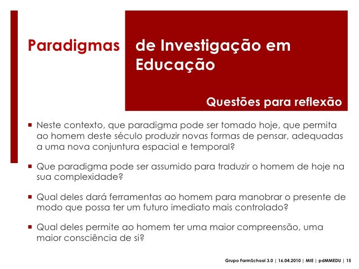 14. 14. "A cada paradigma corresponde uma forma de entender a realidade e encarar os problemas educativos e a evolução processa-se quando surgem novas formas de equacionar as questões impulsionando a que os paradigmas fluam, entrem em conflito na busca de novas soluções para os problemas do ensino e da aprendizagem“(Coutinho, 2006)</li></ul>Grupo FarmSchool 3.0 | 16.04.2010 | MIE | pdMMEDU | 4<br />