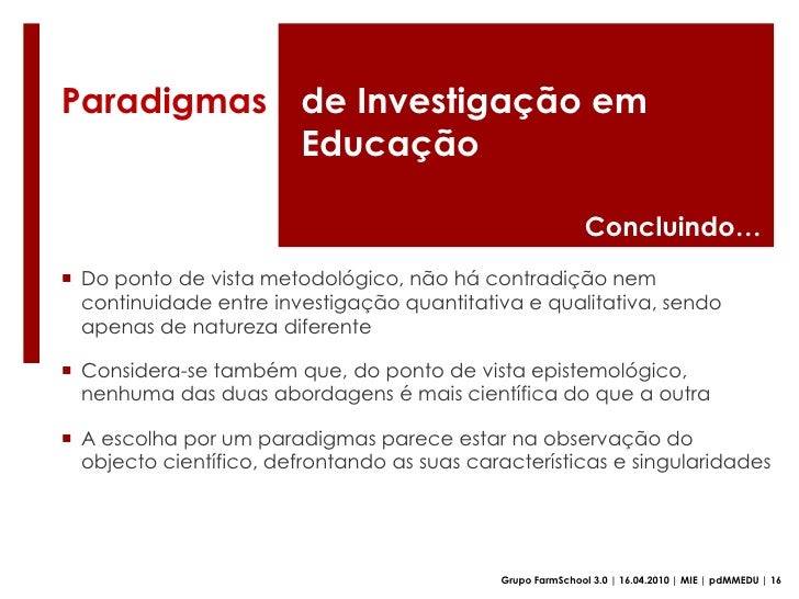 57. 57. A escolha por um paradigmas parece estar na observação do objecto científico, defrontando as suas características e singularidades</li></ul>Grupo FarmSchool 3.0 | 16.04.2010 | MIE | pdMMEDU | 16<br />