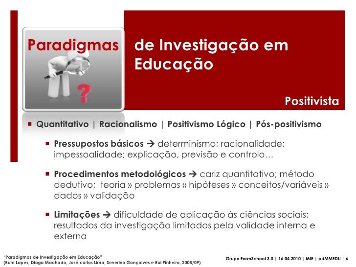 21. 21. Limitações  dificuldade de aplicação às ciências sociais; resultados da investigação limitados pela validade interna e externa</li></ul>“Paradigmas de Investigação em Educação”<br />(Rute Lopes, Diogo Machado, José carlos Lima; Severino Gonçalves e Rui Pinheiro, 2008/09)<br />Grupo FarmSchool 3.0 | 16.04.2010 | MIE | pdMMEDU | 6<br />