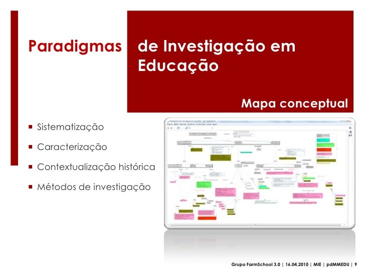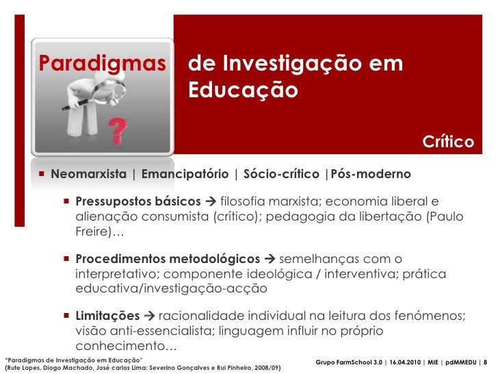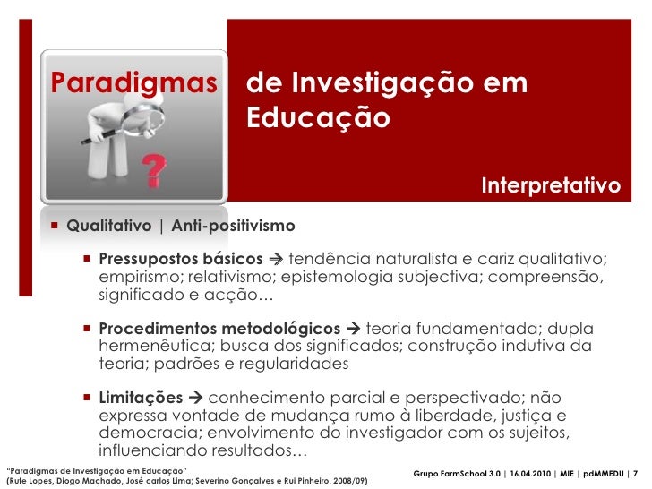 25. 25. Limitações  conhecimento parcial e perspectivado; não expressa vontade de mudança rumo à liberdade, justiça e democracia; envolvimento do investigador com os sujeitos, influenciando resultados…</li></ul>“Paradigmas de Investigação em Educação”<br />(Rute Lopes, Diogo Machado, José carlos Lima; Severino Gonçalves e Rui Pinheiro, 2008/09)<br />Grupo FarmSchool 3.0 | 16.04.2010 | MIE | pdMMEDU | 7<br />
