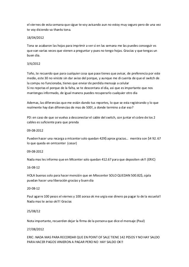 2. 2. el viernes de esta semana que sigue te voy avisando aun no estoy muy seguro pero de una vez te voy diciendo va thanks tona. 18/04/2012 Tona se acabaron las hojas para imprimir a ver si en las semana me las puedes conseguir es que van varias veces que vienen a preguntar y pues no tengo hojas. Gracias y que tengas un buen dia. 3/6/2012 Toño, te recuerdo que para cualquier cosa que pase tienes que avisar, de preferencia por este medio, este 30 no viniste sin dar aviso del porque, y aunque me di cuenta de que el switch de la compu no funcionaba, tienes que enviar de perdida mensaje a celular Si no repotas el porque de la falta, se te descontara el dia, asi que es importante que nos mantengas informado, de igual manera puedes recuperarlo cualquier otro dia Ademas, las diferencias que me están dando tus reportes, lo que se esta registrando y lo que realmente hay dan diferencias de mas de 500!, a donde termino a dar eso? PD: en caso de que se vuelva a desconectar el cable del switch, con juntar el cobre de los 2 cables es suficiente para que prenda 09-08-2012 Pueden hacer una recarga a mtcenter solo quedan 429$ aprox gracias… mentira son $4 92. 67 lo que queda en omtcenter (cesar) 09-08-2012 Nada mas les informo que en Mtcenter solo quedan 412.67 para que depositen ok!! (ERIC) 16-08-12 HOLA buenas solo para hacer mención que en Mtecenter SOLO QUEDAN 500.82$, ojala puedan hacer una liberación gracias y buen dia 20-08-12 Paul agarre 100 pesos el viernes y 100 aoraa ok me urgia ese dinero pa pagar lo de la escuela!! Nada mas te aviso ok!!! Gracias 25/08/12 Nota importante, recuerden dejar la firma de la persona que dice el mensaje (Paul) 27/08/2012 ERIC: NADA MAS PARA RECORDAR QUE EN POINT OF SALE TIENE 142 PESOS Y NO HAY SALDO PARA HACER PAGOS VINIERON A PAGAR PERO NO HAY SALDO OK!!