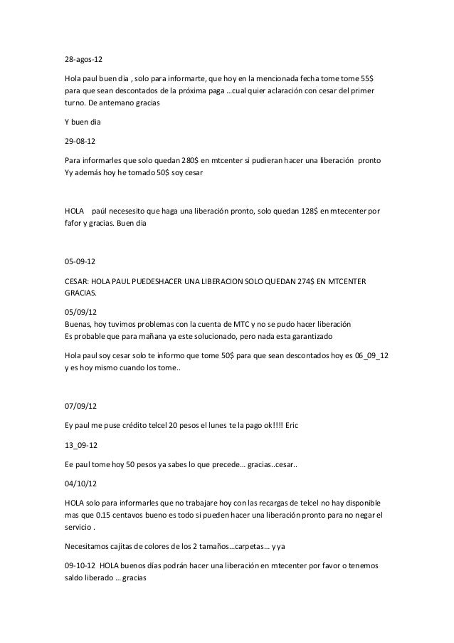 3. 3. 28-agos-12 Hola paul buen dia , solo para informarte, que hoy en la mencionada fecha tome tome 55$ para que sean descontados de la próxima paga …cual quier aclaración con cesar del primer turno. De antemano gracias Y buen dia 29-08-12 Para informarles que solo quedan 280$ en mtcenter si pudieran hacer una liberación pronto Yy además hoy he tomado 50$ soy cesar HOLA paúl necesesito que haga una liberación pronto, solo quedan 128$ en mtecenter por fafor y gracias. Buen dia 05-09-12 CESAR: HOLA PAUL PUEDESHACER UNA LIBERACION SOLO QUEDAN 274$ EN MTCENTER GRACIAS. 05/09/12 Buenas, hoy tuvimos problemas con la cuenta de MTC y no se pudo hacer liberación Es probable que para mañana ya este solucionado, pero nada esta garantizado Hola paul soy cesar solo te informo que tome 50$ para que sean descontados hoy es 06_09_12 y es hoy mismo cuando los tome.. 07/09/12 Ey paul me puse crédito telcel 20 pesos el lunes te la pago ok!!!! Eric 13_09-12 Ee paul tome hoy 50 pesos ya sabes lo que precede… gracias..cesar.. 04/10/12 HOLA solo para informarles que no trabajare hoy con las recargas de telcel no hay disponible mas que 0.15 centavos bueno es todo si pueden hacer una liberación pronto para no negar el servicio . Necesitamos cajitas de colores de los 2 tamaños…carpetas… y ya 09-10-12 HOLA buenos días podrán hacer una liberación en mtecenter por favor o tenemos saldo liberado … gracias