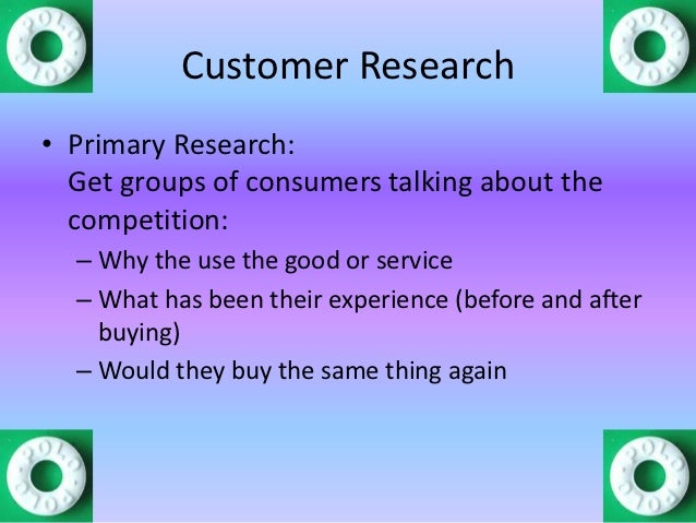 Customer Research• Primary Research:  Get groups of consumers talking about the  competition:  – Why the use the good or s...