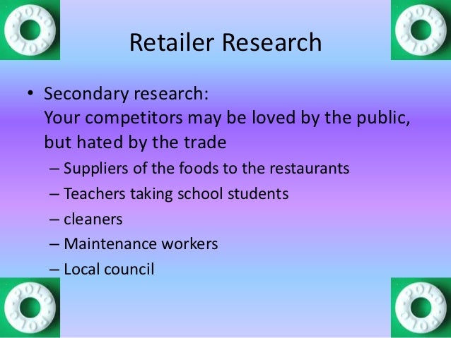6. 6. Retailer Research• Secondary research: Your competitors may be loved by the public, but hated by the trade – Suppliers of the foods to the restaurants – Teachers taking school students – cleaners – Maintenance workers – Local council