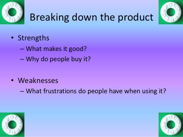 Breaking down the product• Strengths  – What makes it good?  – Why do people buy it?• Weaknesses  – What frustrations do p...