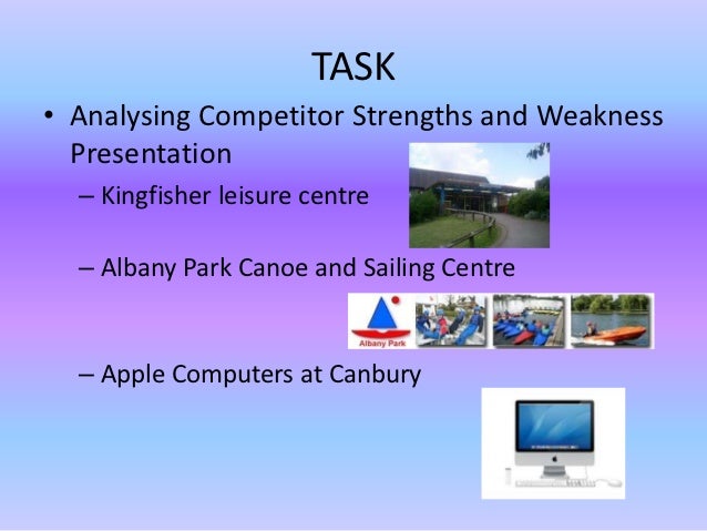 8. 8. TASK• Analysing Competitor Strengths and Weakness Presentation – Kingfisher leisure centre – Albany Park Canoe and Sailing Centre – Apple Computers at Canbury