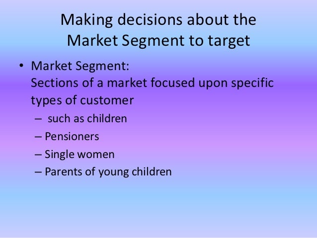 9. 9. Making decisions about the Market Segment to target• Market Segment: Sections of a market focused upon specific types of customer – such as children – Pensioners – Single women – Parents of young children