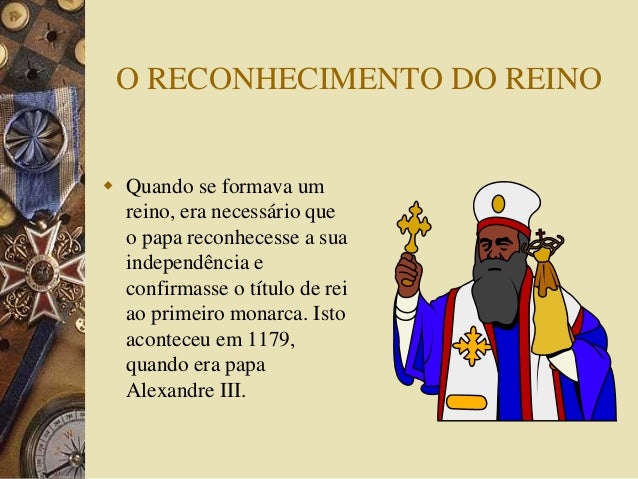 10. 10. O RECONHECIMENTO DO REINO  Quando se formava um reino, era necessário que o papa reconhecesse a sua independência e confirmasse o título de rei ao primeiro monarca. Isto aconteceu em 1179, quando era papa Alexandre III.