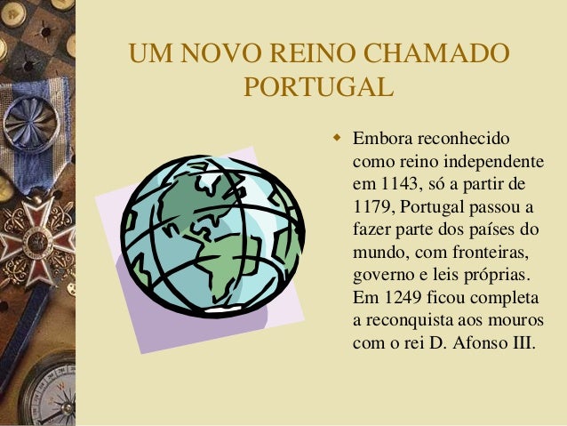 11. 11. UM NOVO REINO CHAMADO PORTUGAL  Embora reconhecido como reino independente em 1143, só a partir de 1179, Portugal passou a fazer parte dos países do mundo, com fronteiras, governo e leis próprias. Em 1249 ficou completa a reconquista aos mouros com o rei D. Afonso III.