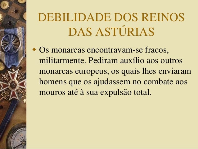 3. 3. DEBILIDADE DOS REINOS DAS ASTÚRIAS  Os monarcas encontravam-se fracos, militarmente. Pediram auxílio aos outros monarcas europeus, os quais lhes enviaram homens que os ajudassem no combate aos mouros até à sua expulsão total.