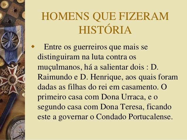 4. 4. HOMENS QUE FIZERAM HISTÓRIA  Entre os guerreiros que mais se distinguiram na luta contra os muçulmanos, há a salientar dois : D. Raimundo e D. Henrique, aos quais foram dadas as filhas do rei em casamento. O primeiro casa com Dona Urraca, e o segundo casa com Dona Teresa, ficando este a governar o Condado Portucalense.
