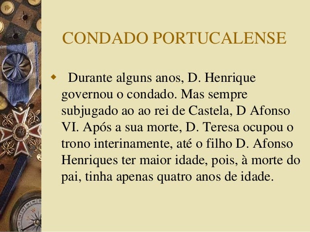5. 5. CONDADO PORTUCALENSE  Durante alguns anos, D. Henrique governou o condado. Mas sempre subjugado ao ao rei de Castela, D Afonso VI. Após a sua morte, D. Teresa ocupou o trono interinamente, até o filho D. Afonso Henriques ter maior idade, pois, à morte do pai, tinha apenas quatro anos de idade.