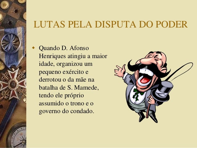 6. 6. LUTAS PELA DISPUTA DO PODER  Quando D. Afonso Henriques atingiu a maior idade, organizou um pequeno exército e derrotou o da mãe na batalha de S. Mamede, tendo ele próprio assumido o trono e o governo do condado.