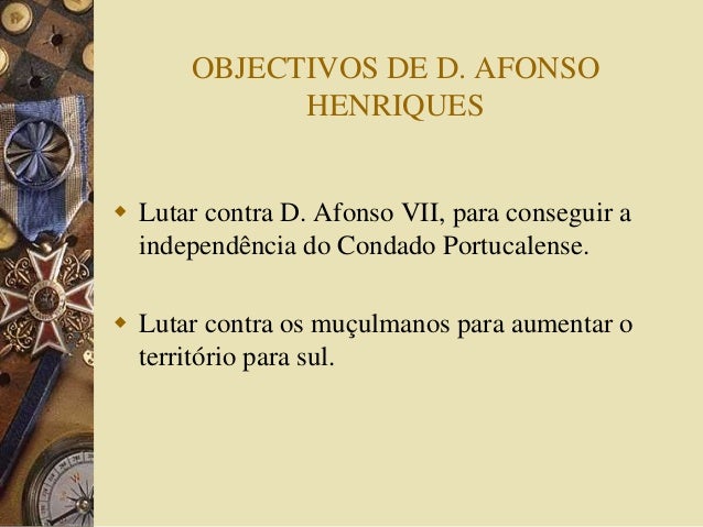 7. 7. OBJECTIVOS DE D. AFONSO HENRIQUES  Lutar contra D. Afonso VII, para conseguir a independência do Condado Portucalense.  Lutar contra os muçulmanos para aumentar o território para sul.