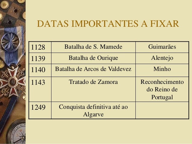 8. 8. DATAS IMPORTANTES A FIXAR 1128 Batalha de S. Mamede Guimarães 1139 Batalha de Ourique Alentejo 1140 Batalha de Arcos de Valdevez Minho 1143 Tratado de Zamora Reconhecimento do Reino de Portugal 1249 Conquista definitiva até ao Algarve