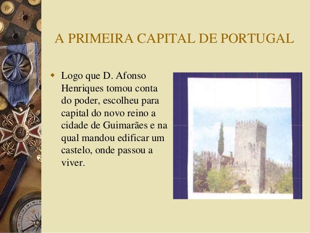 9. 9. A PRIMEIRA CAPITAL DE PORTUGAL  Logo que D. Afonso Henriques tomou conta do poder, escolheu para capital do novo reino a cidade de Guimarães e na qual mandou edificar um castelo, onde passou a viver.