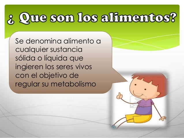 1. 1. Se denomina alimento acualquier sustanciasólida o líquida queingieren los seres vivoscon el objetivo deregular su metabolismo