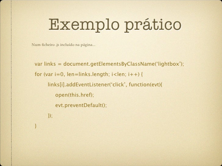 15. 15. Exemplo prático Num ficheiro .js incluído na página... var links = document.getElementsByClassName(‘lightbox’); for (var i=0, len=links.length; i<len; i++) { links[i].addEventListener(‘click’, function(evt){ open(this.href); evt.preventDefault(); }); }