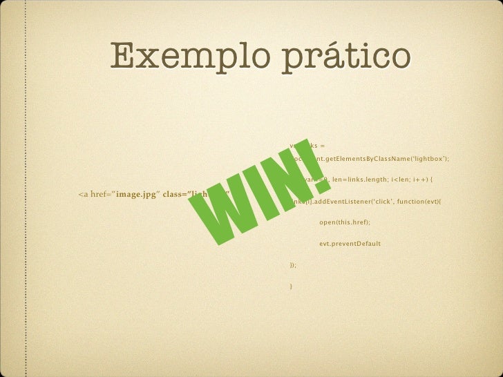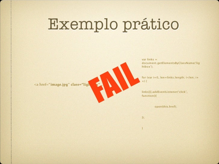 18. 18. Exemplo prático L var links = I document.getElementsByClassName(‘lig htbox’); FA for (var i=0, len=links.length; i<len; i+ +) { <a href=”image.jpg” class=”lightbox” ... links[i].addEventListener(‘click’, function(){ open(this.href); }); }