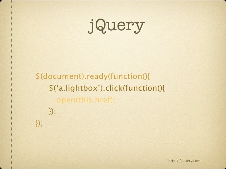 21. 21. jQuery $(document).ready(function(){ $(‘a.lightbox’).click(function(){ open(this.href); }); }); http://jquery.com