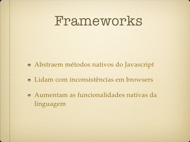 23. 23. Frameworks Abstraem métodos nativos do Javascript Lidam com inconsistências em browsers Aumentam as funcionalidades nativas da linguagem