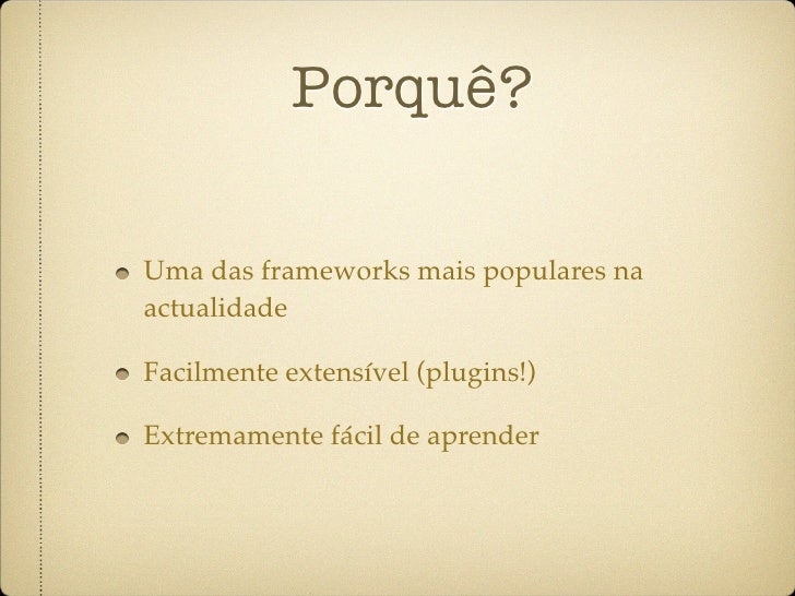 25. 25. Porquê? Uma das frameworks mais populares na actualidade Facilmente extensível (plugins!) Extremamente fácil de aprender