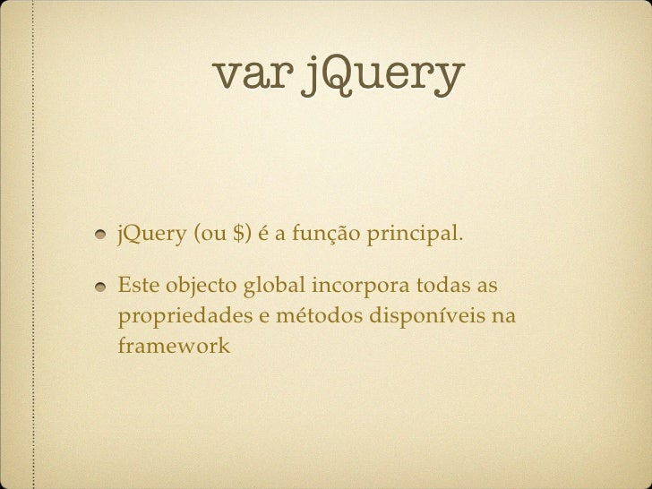 26. 26. var jQuery jQuery (ou $) é a função principal. Este objecto global incorpora todas as propriedades e métodos disponíveis na framework