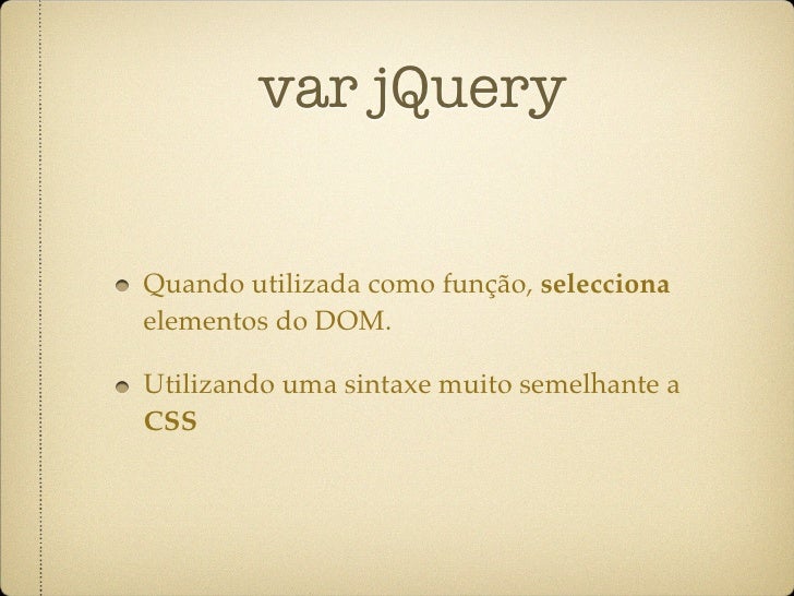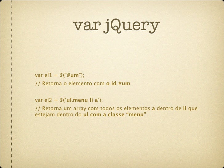 28. 28. var jQuery var el1 = $(“#um”); // Retorna o elemento com o id #um var el2 = $(‘ul.menu li a’); // Retorna um array com todos os elementos a dentro de li que estejam dentro do ul com a classe “menu”