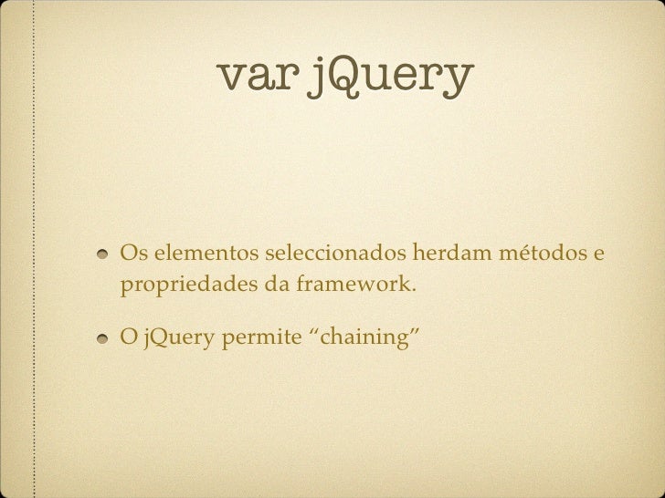 29. 29. var jQuery Os elementos seleccionados herdam métodos e propriedades da framework. O jQuery permite “chaining”