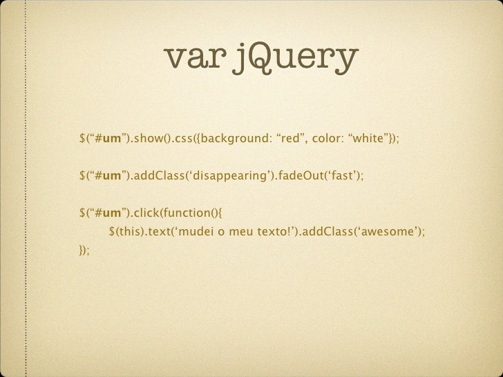 30. 30. var jQuery $(“#um”).show().css({background: “red”, color: “white”}); $(“#um”).addClass(‘disappearing’).fadeOut(‘fast’); $(“#um”).click(function(){ $(this).text(‘mudei o meu texto!’).addClass(‘awesome’); });