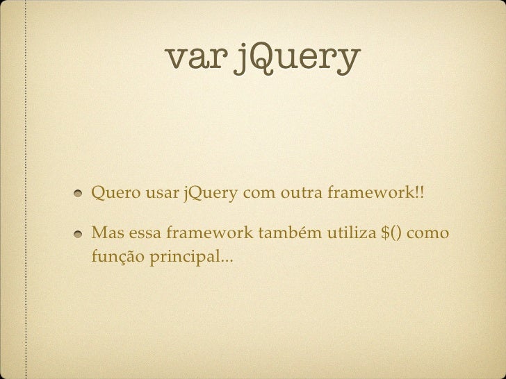 31. 31. var jQuery Quero usar jQuery com outra framework!! Mas essa framework também utiliza $() como função principal...
