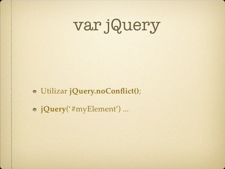 32. 32. var jQuery Utilizar jQuery.noConflict(); jQuery(‘#myElement’) ...