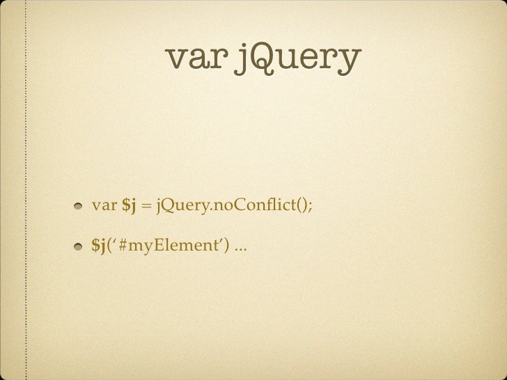 33. 33. var jQuery var $j = jQuery.noConflict(); $j(‘#myElement’) ...