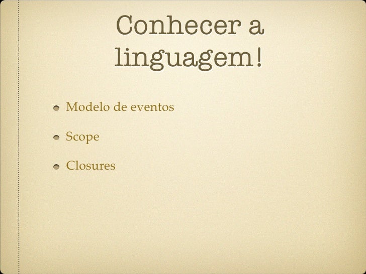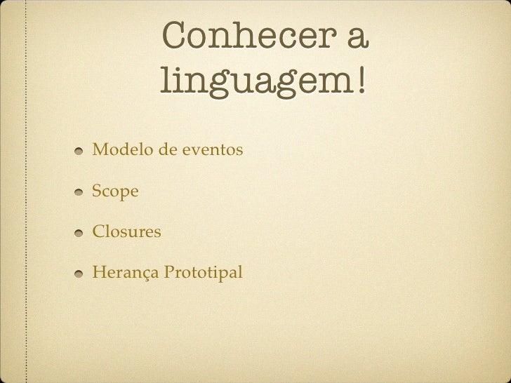 38. 38. Conhecer a linguagem! Modelo de eventos Scope Closures Herança Prototipal